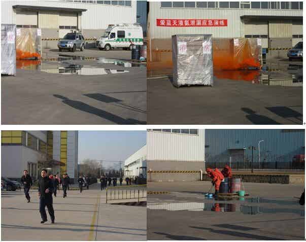 2016年12月16日上午,我公司与市环保局大孤山半岛分局联合举行液氨泄漏应急演练。在我公司厂院内,参演队伍模拟了险情突发、启动公司三级生产安全事故应急预案、喷淋稀释、人员疏散、员工穿防化服抢修、上报相关部门和单位、联络外部协助、收集废液、防化服洗消、环保监测评估等细节。演练获得圆满成功,受到环保局的赞赏。