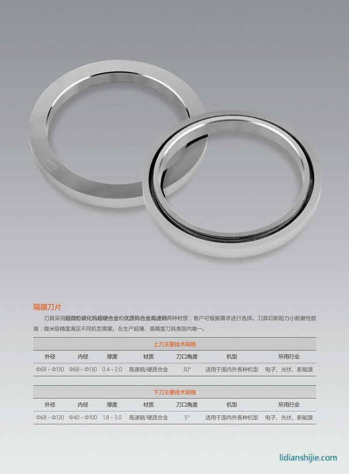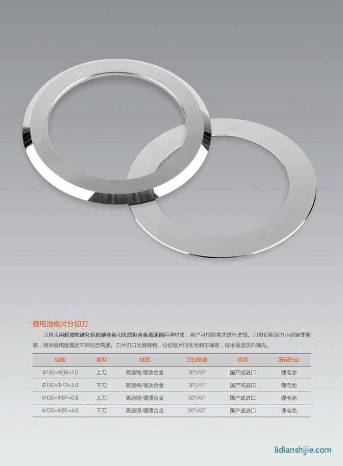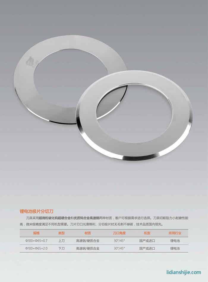 锂电池极片分切刀和隔膜刀片是公司近年来特别针对锂电池行业对分切刀和切口的较高要求专门研发生产的重点产品。在锂电池分切刀、隔膜刀行业国内排名上,欧林机械排名第一,我公司排名第二。这两种产品均可采用超微粒碳化钨硬合金和优质钨合金高速钢两种材质,客户可根据需要进行选择,刀具切断阻力小耐磨性能高,微米级精度满足不同机型需要。锂电池极片分切刀刀片刃口光滑锋利、分切极片时无毛刺,不掉碳,技术品质国内领先,其中的蝶形刀广泛应用于电子电容器行业,在国内市场的占有率高达80%以上,遥遥领先于同行业,同时可满足一些海外用户的需求;隔膜刀片在生产超薄、高精度隔膜刀具类领域内是国内唯一。