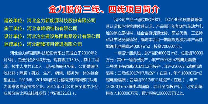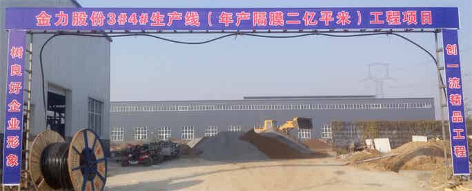 2016年11月1日,在欢庆的鞭炮声中,我公司高性能锂电池隔膜项目3#、4#厂房开工,年产隔膜2亿平方米。该产品属于新能源汽车动力电池的核心原材料,结合全国市场需求状况,引进国外一流生产线。它的建设为金力股份实现跨越发展打下了良好的基础。