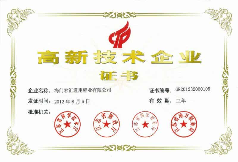 2012年8月6日,江苏省科学技术厅为我公司颁发了高新技术企业证书,公司通过了高新技术企业认定,可喜可贺。