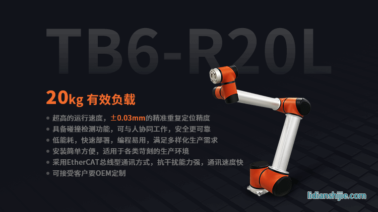 以往,协作机器人因其灵活轻量的特征,主要被客户用来处理对负载要求不高的任务。但近年来越来越多的企业希望在更高负载的领域也使用协作机器人来替代过往由传统工业机器人操作的任务。在市场对大负载机器人有着急切的需求时,深圳泰科智能机器人TB6-R20L协作机器人在负载能力、作业范围等多方面实现了全面突破,在实现20KG大负载和1500mm工作半径的同时,重复定位精度高达±0.03mm,重新定义了协作机器人,并已经成功为客户定制30KG大负载的协作机器人。