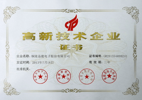 2013年10月28日,我公司收到安徽省科技厅、财政厅、国家税务局和地方税务局联合颁发的《高新技术企业证书》,证书有效期三年。