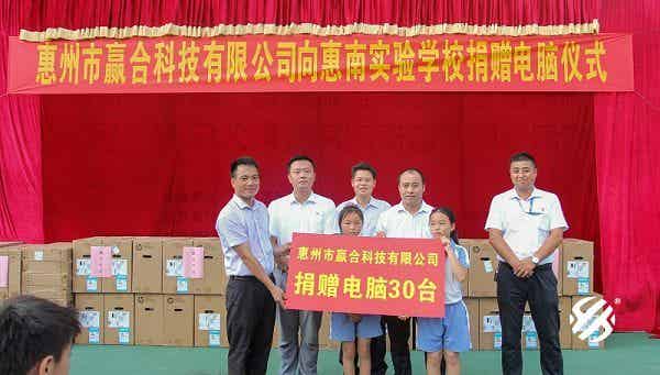 6月27日, 尽管骄阳似火,但是在惠南实验学校里吹起了一股充满爱心的清风。惠南高新技术产业园管委会、惠州市赢合科技有限公司在此举行电脑捐赠仪式,管委会领导及公司副总裁王振东、总裁办主任柳小舟等受董事长王维东先生的委托共同出席了仪式。