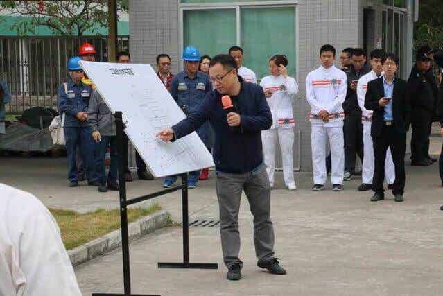 张良均总监向中山市消防局一行详细介绍公司消防平面图及讲解锂离子电池生产工艺流程。