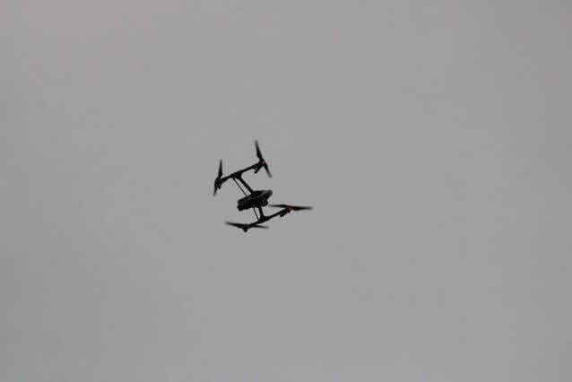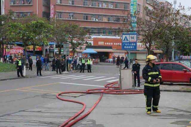 运用无人机探测发生事故区域,赶到现场的消防员们先迅速拉好警戒线,然后用水管不断向模拟发生事故的区域冲水。