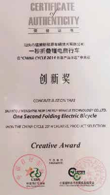 日前,由中国自行车协会、中国国际自行车展览会组委会主办的“CHINA CYCLE2014创新产品评选活动”经专家评委历经一个半月的评选,最终结果已出炉,猛狮科技旗下猛狮新能源车辆技术有限公司最新推出的一秒折叠锂电自行车荣获“CHINA CYCLE2014创新奖”。