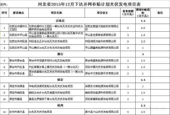 为确保完成国家下达的建设规模并支持项目加快建设,结合河北省项目进展情况,现补充下达一批并网补贴计划。本次安排的项目均经过各市申报,并已征求电网公司意见,确保计划安排公平公开。现对本次光伏发电项目并网补贴计划安排情况予以公示(详见附件)。