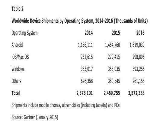 智能手机出货量今年可能增长3.7%,有望接近20亿台。“智能手机市场正在向高端和低端市场两个极端方向发展。”Gartner研究总监安妮特·齐默曼(Annette Zimmermann)说,“一方面,平均售价447美元的高端手机在2014年被iOS主导。另一方面,Android和其他开放系统的增长主要集中于低端市场,平均售价只有100美元左右。中端市场的机会变得越来越有限。”