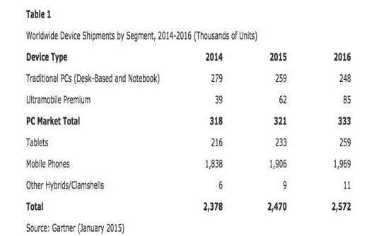 今年全球计算设备(PC、平板电脑、超移动设备和手机)2015年的出货量预计将达到25亿台,较2014年增长3.9%。其中,传统PC预计为2.59亿台,超移动设备为6200万台,平板电脑为2.33亿台,手机为19.1亿台,其他混合和翻盖设备为900万台。