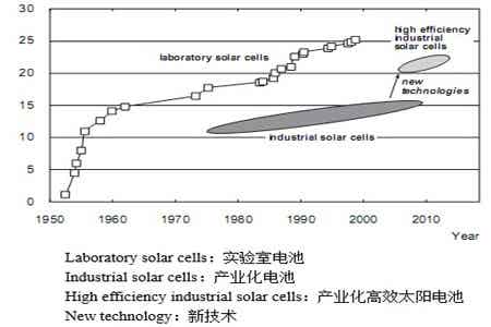 毫无疑问,硅电池是促进光伏产业前进的中坚力量。而太阳能电池组件中,大约80%的电力都来源于晶体硅组件。第一个晶体硅电池出现在1954年,恰宾和卡尔松等人在贝尔实验室用表面抛光的硅片制作PN结,然后分别在两侧蒸镀上金属电极,就制成了光伏转换效率达6%的世界上第一块实用性硅太阳电池,成为现代硅太阳电池时代的开始。经过几十年的发展,晶体硅太阳电池经历了几个快速发展期,效率得到不断攀升,从最初的8%提升至目前的25%(实验室效率),正如图2所示。