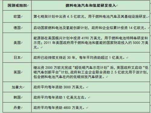 长期以来,世界各国政府和主要汽车集团都高度重视燃料电池汽车研发,投入大量资金用于燃料电池汽车及氢能研发、试验考核和市场培育。继在第六框架计划中拿出大量资金用于燃料电池汽车和氢能研究,2009年,欧盟批准燃料电池和氢能技术项目行动计划,计划从欧盟第七框架计划中拿出4.7亿欧元,持续资助燃料电池汽车及基础设施技术研发。德国政府高度重视燃料电池汽车及氢能研发,交通部、环境署、经济部等部门联合启动燃料电池及氢能国家创新计划,拟与企业联合资助14亿欧元,用与燃料电池汽车、氢能等关键技术研发,以确定德国在燃料电池汽车领域的国际领先地位和竞争力。以经产省为代表的日本政府高度重视并持续开展燃料电池汽车和氢能开发,在过去30年时间内先后投入上千亿日元用于燃料电池汽车和氢能的基础科学研究、技术攻关和示范推广。隶属于经产省的燃料电池商业化组织(FCCJ)先后与2009年7月和2010年7月发布了《燃料电池汽车和加氢站2015年商业化路线图》,明确指出2011年-2015年开展燃料电池汽车技术验证和市场示范,随后进入商业化示范推广前期。为落实燃料电池汽车在日本的推广,2011年1月,包括丰田、本田、尼桑三大汽车厂商在内的日本13家汽车和能源企业共同签订协议,决定在东京、大阪、名古屋和福冈四大都市圈的市区和高速公路上建立100座加氢站,并通过完善设计、改善生产技术等方法大幅降低燃料电池汽车生产成本,培育燃料电池汽车市场。美国政府对燃料电池汽车支持在布什任职期间达到顶峰,在奥巴马政府期间,美国能源部宣布从美国振兴计划(American Recovery and Reinvestment Act Funding)中拨款4190万美元支持燃料电池特种车的研发和示范,另在2011年美国财政预算中安排5000万美元用于燃料电池和氢能技术研发。此外,加拿大、韩国、澳大利亚、巴西、法国和英国等国家政府积极支持燃料电池汽车和氢能研发。2009年,戴姆勒、福特、通用、丰田、本田和现代汽车6个世界主要汽车公司签署备忘录,持续开展燃料电池汽车研发,计划于2015大力推广燃料电池汽车,并快速形成几十万辆燃料电池汽车保有量。与此同时,在德国交通部长见证下,德国巴符能源公司(德国第三大电力公司)、奥地利OMV石油公司、壳牌公司、法国道达尔公司(全球第四大石油化工公司)和瑞典Vattenfall(欧洲第五大能源公司)等全球大型能源公司签订备忘录,决定在德国建设燃料电池汽车基础设施以促进燃料电池汽车在德国的推广。