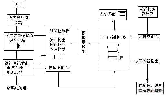 大容量镉镍电池以其放电电流大,使用寿命长等优点长期以来在*、铁路、电力、石油等领域占有举足轻重的地位。但是镉镍电池明显的缺点就是存在“记忆”效应,它的存在大大的降低了电池的利用效率、严重时电池组不能放电。例如:铁路客车上大量使用的由GN300Ah镉镍电池组成的电池组,在段修中须同时对其进行检修维护,主要就是对其进行容量恢复。为满足该项工作的工艺要求,在路局科委的支持下,通过与专业厂家合作,开发研制了利用西门子S7200可编程序控制器为控制中心,加上可控硅充放电技术的电池智能维护系统。此系统具有对镉镍电池进行充电、放电和自动维护(如:自动三充两放)等功能,充放电电流最高可达300A,电压最高可达500V。加上大屏幕触摸屏操作界面,具有各种参数设定方便,记录自动存储,数据自动打印,充放电自动转换等优点,较大地提高了工作效率,减轻了充电工人的劳动强度,提高了设备质量和工作性能。下面,将该系统简述如下: