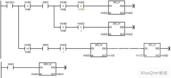 梯形图程序中VW302为电压显示值寄存器,VW68为电压设定值寄存器;VW300为电流显示值寄存器,VW66为充电电流设定值寄存器;VW632为模数转换数字量暂存器。Q0.3闭合表示充电,当电池组电压值VW302小于设定值VW68且电流值VW300小于设定充电电流值VW66,模拟量输出值VW632不断增大到充电电流等于设定电流值为止(VW632最大值为31999);反之,VW632值不断递减。当充电电压高于设定的电压值时,模拟量输出值不断递减,保证充输出电电压不高于设定的电压值。