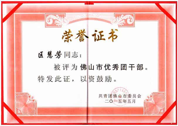 为表彰先进,激励全市基层团组织和广大团员、团干部勤勉敬业,奋发有为,共青团佛山市委员会决定表彰一批优秀集体和优秀个人。我司区慧芳同志经公司党委研究同意,由公司团委推荐参加2014年度佛山市优秀团干评选活动。经过严格筛选,共青团佛山市委员会决定授予区慧芳同志“佛山市优秀团干”称号。