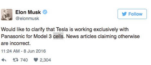 马斯克今天发布推文称,松下是特斯拉Model3电动汽车的独家电池供应商,有关其他厂商为Model3供应电池的新闻报道并不属实。他随后又发布推文称,Model S和Model X的电池也是由松下供应。