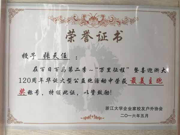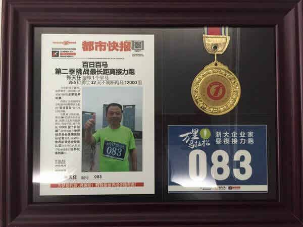 近日,由浙大企业家同学会和都市快报联合发起的“百日百马”第二季万里征程活动圆满闭幕。来自国内外30多个城市的285位跑马勇士,经历了32天昼夜不息半马接力跑,累计跑步12000里,创造了“世界上距离最长马拉松接力跑”的世界纪录。天能集团董事长张天任参加了第83棒接力,完成一个“半马”。张天任与跑友们一起共同创造及见证了这项世界纪录的诞生。同时,他还被组委会授予“最美主跑奖”称号。