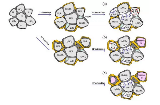 实际是我们所说的SiO并不是纯的SiO而是Si和Si的多种氧化物的复合物。生产中SiO是利用Si和SiO2在真空中高温反应而成,但是SiO在热力学上是不稳定的,在1000-1400℃下会发生歧化反应,生成Si和Si2O3,STEM观察也发现无定形SiOx中非均匀的分布着一些无定形纳米Si。此外由于高温的作用,在SiOx中还存在着一些结晶Si,因此我们实际使用的Si具有多种Si的形态。理论研究发现,SiOx嵌锂动力学特征与Si材料并不相同,Li嵌入到SiOx中,会形成多种化合物,例如Li2O,Li2Si2O5,Li2SiO3,Li4SiO4等,而且这一过程是不可逆的,这些锂硅化合物会成为Si负极体积膨胀的缓冲带,抑制硅负极的体积膨胀,但是这种缓冲作用是有限的,不能完全保证SiOx材料的循环性能。