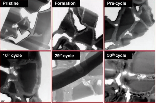 当Si与Li形成Li4.4Si结构时,理论比容量可以达到4200mAh/g,当然如此高的容量自然是要付出代价的,充电状态的Si负极体积膨胀可以达到300%,这成为了阻拦在Si负极应用路上最大的障碍。为了克服这一困难人们也做了很多努力,Si纳米颗粒,石墨复合,薄膜电极,SiOx材料等,这些材料在体积膨胀方面都得到了一定的改善,特别是SiOx材料,是距离成功最近的负极材料━体积膨胀有了明显的改善。但是这些材料相比于石墨材料,还是存在循环寿命不足的问题,下面我们就一起探讨一下Si负极的失效机理。