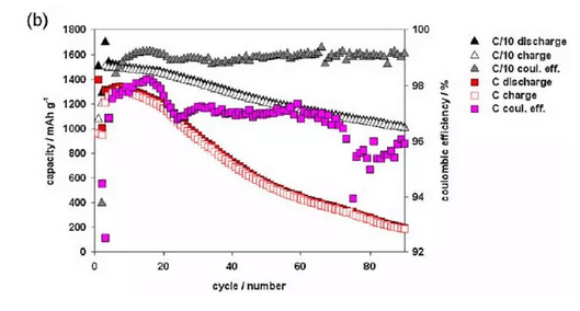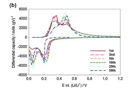 与此相对的另一种失效方式称作全面失效,主要特征为负极材料从极片上脱落导致失效。从库伦效率曲线上可以注意到前30次时,比容量和库伦效率在同时下降,这表明在前期“局部失效”和“全面失效”同时存在,而在30次以后库伦效率开始回升,而比容量仍然在继续下降,这意味着在30次以后只有“全面失效”一种模式。循环伏安测试也发现循环初期的电极极化较小,而当循环到50次以后,电极的极化明显增大,表明电极内部结构的变化导致了电极阻抗的增加。实验中发现,硅负极的失效与极片所受的压力有着密切的关系,一般来讲高倍率下极片的压力较大,而低倍率下极片的压力则较小,从电池的循环曲线上可以注意到,大倍率下电池的衰降更快,而小倍率充放电时容量衰减则要慢的多。