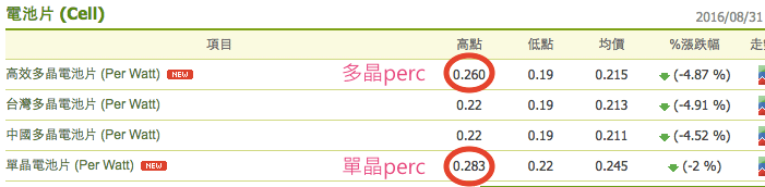 所幸,中国“领跑者计划”需采用高效电池,单、多晶perc产品近期询问度高,虽台湾省perc量产的量、与效率首屈一指,但一般电池的跌幅也带动perc价格跌价明显,目前转换效率20.8%的单晶perc价格已到US$0.28/W上下,多晶perc则约在US$0.255~0.26/W之间。