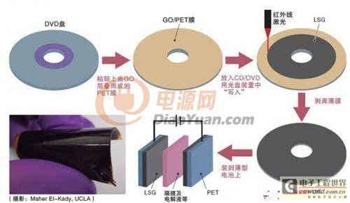 UCLA开发的石墨烯电极材料的制造方法,以及采用该方法制造的柔性充电电池。在CD或DVD上贴上氧化石墨(GO)薄膜,将其放入CD/DVD的光驱,用红外线激光照射后,GO可变成多层石墨烯(LSG)。