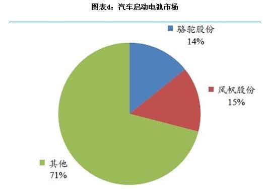 汽车启动电池:汽车启动要求铅酸电池短时间内提供大功率,一般需要100-200A的电流,汽车整车厂商对于供应商有严格的认证机制,只有少数大型企业能够进入这一市场,但是对于维护市场,区域分布广泛,由于受到运输、市场推广成本的影响,中小厂商具备比较明显的区域特性。