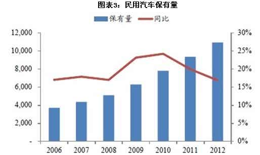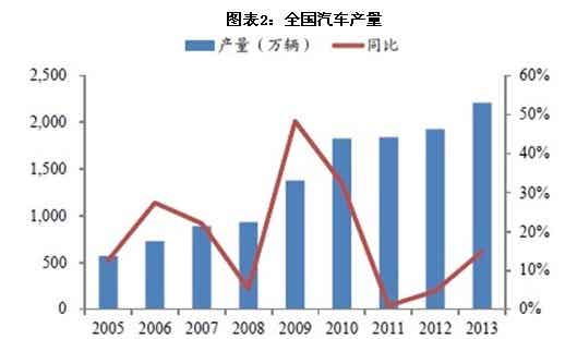 我国已成为全球最大的汽车销售市场,2013年我国汽车民用汽车保有量达到近1.3亿量,增长超过15%,汽车产销量达到2198万辆,同比增长6.6%,按照12V80Ah的规格计算,2013年汽车启动电池的需求约为9197万千伏安时,预计未来两年汽车启动电池市场将保持10%-15%的增速。
