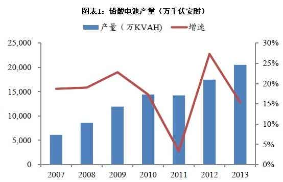 尽管近年来锂离子电池成为热点,但是铅酸电池作为技术成熟的化学电源,凭借其安全性高、价格低廉等优势在绝大多数传统领域和部分新兴应用领域占据着牢固的地位;根据国家统计局的数据,2013年我国铅酸蓄电池产量达到2.05亿千伏安时,同比增长15.4%,从2007年到2013年间,除了2011年行业整治造成产量增速下滑以外,行业复合增速达到22%。