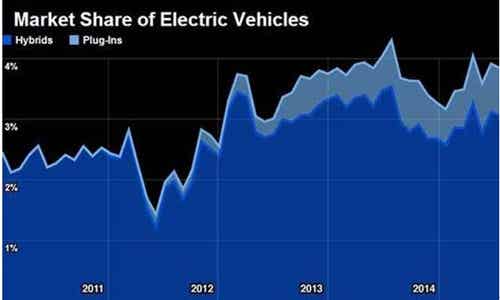 从图中可见,2014年插电式混合动力汽车的平均比例为1.5%。按表中这种渐进增长的趋势,要到本世纪末,这类汽车才能主导市场。