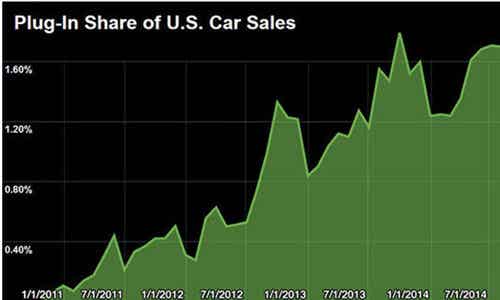 以上图表显示了插电式混合动力汽车在美国汽车销量中的占比。