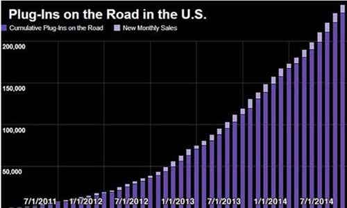 从以上图表可见,自2010年12月以来,美国市场中插电式混合动力汽车的销量成指数不断倍增。