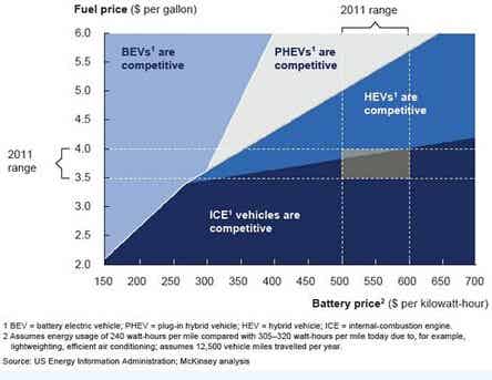 但这所谓的每千瓦时300美元,除了显示电动车电池成本下降速度超乎预期外,是否还意味着电动车时代即将来临呢?全球顾问公司麦肯锡(Mckinsey&Company)在2011年曾做了一张图表,显示不同的油价与电池价格情况下,纯电动车、插电式混合电动车、油电混合车及一般汽车谁更具竞争力,灰色区块的部分则是2011年的价格区间。从下图图表中可以看出,当电动车电池价格位于每千瓦时约300美元左右时,就是电动车竞争力逐渐起飞的时刻。