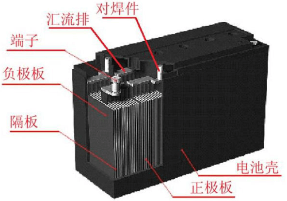 铅酸电池的正极材料主要是由PbO2组成,负极材料主要是Pb组成,电解液通常是稀硫酸。在放电过程中遵循双硫酸盐反应规则,正负极材料上都有PbSO4晶粒生成,铅酸蓄电池的标称电压是2V,理论比能量是166.9Wh/kg,实际比能量为35~45Wh/kg。由于电解液存在的导电性,使得铅酸电池存在自放电和充电的时候不允许大电流充电,所以一般铅酸电池的充电都限制在0.3C以下。