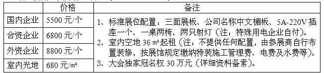 1:展位费用:国际标准展位(3m*3m=9㎡/个)