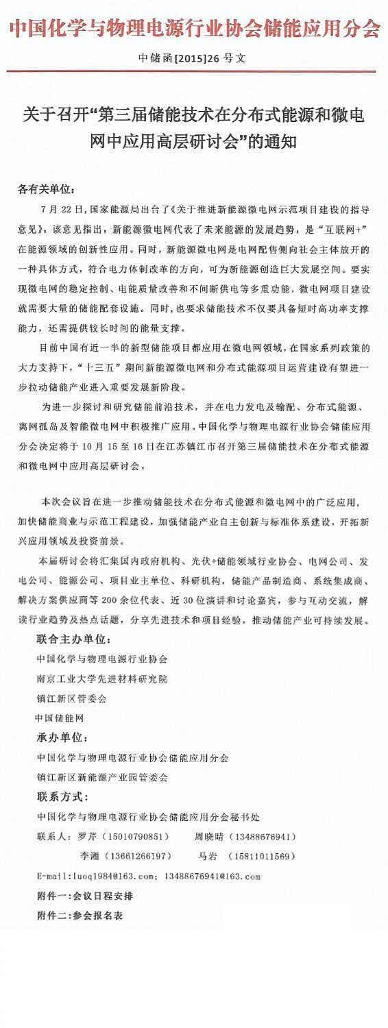 关于召开“第三届储能技术在分布式能源和微电网中应用高层研讨会”的通知