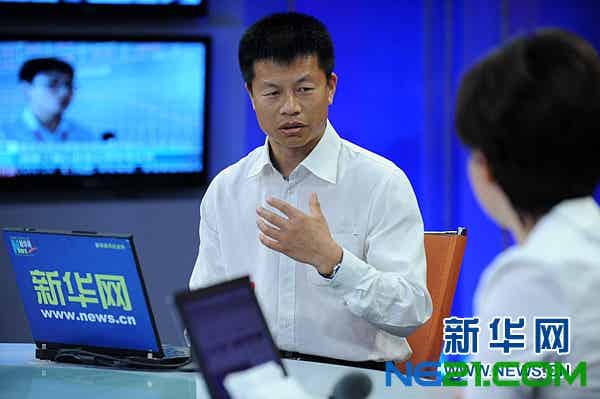 2012年8月9日,日出东方太阳能股份有限公司董事长徐新建做客新华网,谈“践行社会责任,引领绿色未来”。图为嘉宾与主持人交谈。