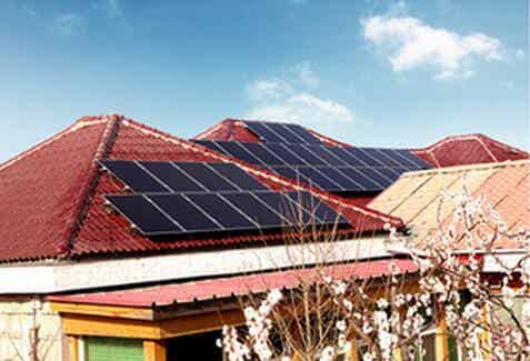 在红色瓦片的映衬下,姜昆家屋顶上的蓝色薄膜太阳能电池板格外醒目。