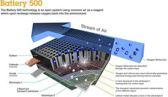 那么“足够好”教授目前又在锂-空气电池领域实现了什么样的突破呢?首先我们先来啰嗦几句什么是锂-空气电池。要知道尽管电池技术在持续发展,但目前我们使用的锂离子电池或者磷酸铁锂电池的能量密度最大只有200Wh/kg左右。换句话说特斯拉汽车续航里程已经算比较大的了,差不多是600公里,但其整车重量已经达到了2吨左右。而锂-空气电池使用碱性固态电解质中的空气作为负极材料,它和锂离子产生的产物是氧化锂Li2O2。目前能够生产出的锂-空气电池的能量密度已经达到了500Wh/kg左右。是目前锂离子电池或者磷酸铁锂电池技术的2.5倍。并且要知道锂-空气电池的理论能量密度的极限是12kWh/kg。也就是说它至少还有20倍的提升空间。而这个理论能量密度已经接近了目前汽油的等效能量密度13kWh/kg。如果考虑上电机的效率是汽油内燃机的2.5倍这个因素的话,锂-空气电池技术完全有实力去全面替代目前的汽油作为新一代理想的汽车动力源。目前蓝色巨人IBM就在成功转型咨询服务行业以后,手握大量的基础技术专利。IBM开始染指锂-空气电池技术,发起了名为The Battery500 project的项目。目标是将电动汽车的续航里程提升到500miles,即800公里。如下就是IBM The Battery500 project原型产品示意图。