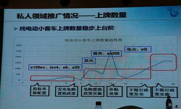 纯电动小客车上牌数量稳步上台阶,2014年1月份上牌量是43辆,现在达到1600辆左右。