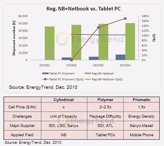 2010年各类消费性电子产品的持续成长,顺势带动了不同应用领域的锂电池的需求。根据EnergyTrend观察,2011年低容量电池芯已达到价格低点,且日系厂商已逐步往下游组装Package 厂移动,韩国电芯厂进行价格战情形将减缓。为了刺激终端需求,高容量电池将开始进行大量商品化。