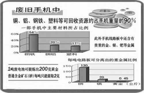 其实在废旧的手机里包含多种有价值的材料,包括0.01%的黄金,20%~25%的铜,40%~50%的可再生塑料。根据一项研究表明,从1吨废弃手机中能提取200克黄金、100公斤铜以及3公斤银。依照我国目前每年废弃1亿部手机估算,这些废旧手机总重达1万吨,若回收处理能提取1500公斤黄金、 100万公斤铜、3万公斤银。所以给手机电池找个好的归宿,既能避免污染环境,还能节约资源。