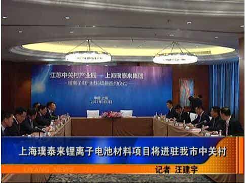 江苏溧阳锂离子电池项目建设又有新突破。3月3日上午,江苏中关村科技产业园管委会与上海璞泰来集团在上海正式签订项目投资协议。上海璞泰来集团董事长梁丰、总经理陈卫、常州市市长丁纯以及溧阳市领导蒋锋、徐华勤、庄松年出席签约仪式。