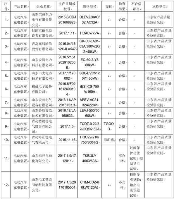 核心提示:3月15日,山东省质量技术监督局发布“2017年第1批电动汽车充电装置产品质量省级监督抽查结果 ”。公告称,2017年第1季度,山东省质量技术监督局组织开展了电动汽车充电装置产品质量省级监督抽查。共抽查了全省12家企业生产的12批次电动汽车充电装置产品。