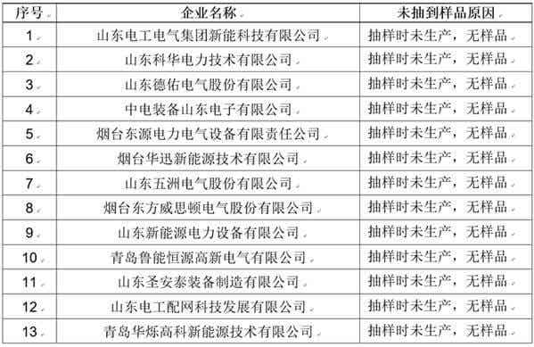 抽查发现有2家企业的2批次产品不符合相关标准的要求,不合格项目为过流保护功能试验、控制导引试验、输出电流误差试验。查出不合格产品的企业分别是山东泰开自动化有限公司、山东电工豪迈节能科技有限公司。此外,还有13家企业因抽查时未生产无样品而未进行抽查。