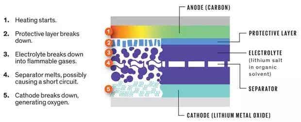 1.热量产生;2.保护层破坏;3. 电解液分解成易燃气体;4.隔膜熔化,可能造成短路;5.阴极破坏,产生氧 图片来源:llustration