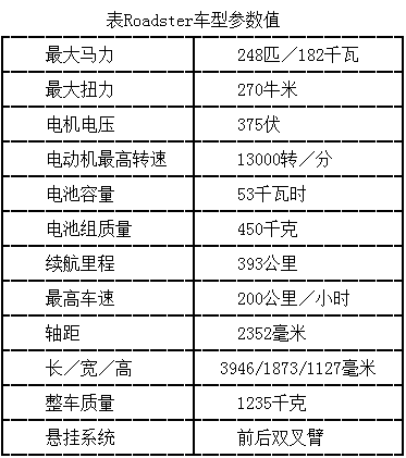 Roadster是第一辆使用锂电池技术的电动车,它基本就是路特斯Elise的纯电动版,每次充电至少能够行驶320公里以上,该项世界纪录(501公里)也是由Roadster于2009年10月27日在澳洲举办的GlobaJ Green Challenge上创立的。Roadster的出色之处在于,哪怕是普通版也能在3.9秒加速到时速100公里,sport运动版更是将时间压缩到3.7秒,将原版车型远远甩在身后。还有官方宣称其充电时间只需3.5小时,续航里程却达到了390多公里,更是给当时的整个行业带来相当大的震撼。直到现在这些数据都是相当出色的成绩,足以让传统汽车巨头推出的其他纯电动车汗颜。