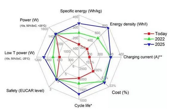 电动汽车的发展需要更好的电池,动力蓄电池的比能量、寿命、安全性和价格,对纯电驱动汽车的发展至关重要。其中具有比能量高、寿命长等优点的锂离子电池是目前最具实用价值的电动汽车电池,在混合动力汽车、纯电动汽车和燃料电池汽车上均得到广泛应用。目前商用动力电池的技术水平和未来10年预期可达到的目标见图1,而实际产品生产中往往这些指标又是互相矛盾的,电池相关性能需要权衡考虑。电池性能的提高需兼顾电极材料、电解液、隔膜的性能,同时装配技术、电池系统成组、管理技术的跟进也至关重要。本文旨在从锂电池生产材料、单体电池设计和制造技术、电池系统技术等方面总结目前以锂离子电池为核心的动力电池发展成就,同时展望未来!