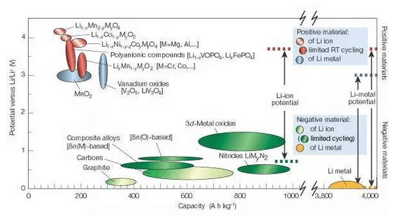 锂电正负极材料体系非常丰富(图2),目前,钴酸锂、锰酸锂、磷酸铁锂、镍钴锰锂等正极材料研究已趋于成熟。钴酸锂材料比容量有200210mA·h/g,其材料真密度和极片压实密度均是现有正极材料中最高的,商用钴酸锂/石墨体系的充电电压可提升4.40V,已经可满足智能手机和平板电脑对高体积能量密度软包电池的需求。锰酸锂原料成本较低、生产工艺简单、热稳定性高、耐过充性好、放电电压平台高、安全性高。适合作为轻型电动车辆的低成本电池,但存在理论容量比较低,循环过程中可能有锰元素的溶出影响电池在高温环境中的寿命等问题。