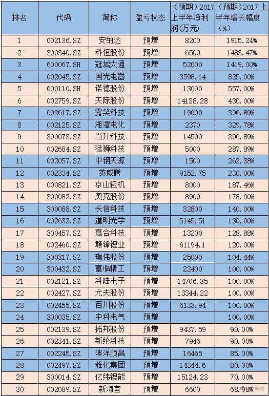 2017上半年锂电新能源产业链相关上市公司业绩(预告)排行榜,如下表所示: