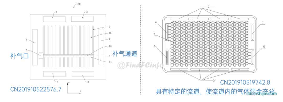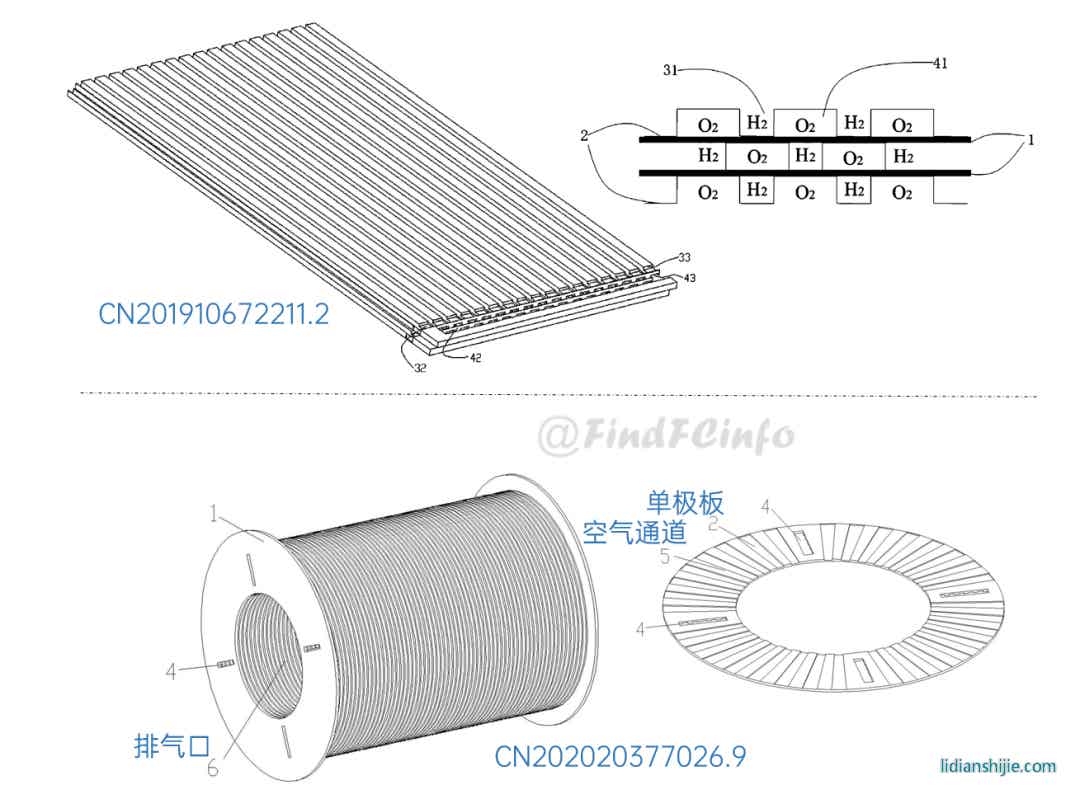 另外,格力还公开了两种风冷型电堆,如专利CN201910672211.2公开的电堆中,膜电极和单极板在电池单元叠置方向间隔交错设置,每一单极板的两侧分别形成阳极气体槽道和阴极气体槽道,相比于现有常规金属双极板燃料电池结构,该电堆厚度能大约降低一半,极板两侧分别为阳极气体和阴极气气体的流动空间。专利CN202020377026.9中电堆增加了进风区域面积,形成了更加均匀的进风结构,有利于提高阴极反应气体传质、提高阴极反应气体流量、降低其流动阻力等。